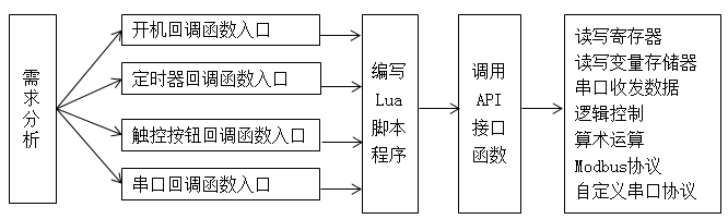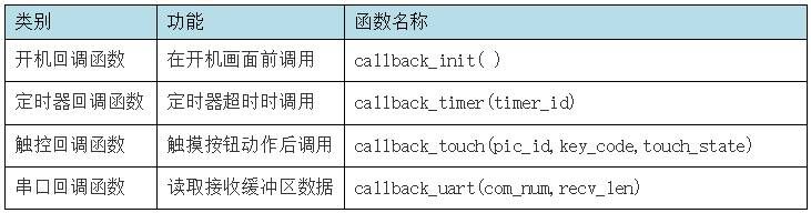 用戶根據(jù)應(yīng)用需要,在回調(diào)函數(shù)里編寫Lua腳本程序,并下載到串口屏里。串口屏會根據(jù)回調(diào)函數(shù)類型,在不同的時間點執(zhí)行對應(yīng)回調(diào)函數(shù)里面的用戶Lua腳本程序。